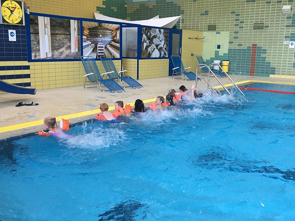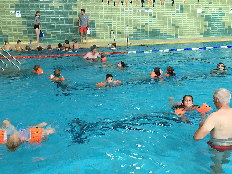 Plitsch, platsch – wie das spritzt! In der ersten Stunde des Schwimmkurses dürfen die Fünf- bis Siebenjährigen erstmal zum Aufwärmen mit den Beinen strampeln, dass das Wasser nur so schäumt. Dabei halten sie sich mit den Händen am Beckenrand fest, während Schwimmtrainer Wolfgang Schmidt die Kinder mit ein paar aufmunternden Anweisungen spielerisch motiviert. Dann wird’s ernst mit den Übungen im Wasser. „Ein bisschen Disziplin muss schon sein“, sagt Siegfried Held, der zweite ehrenamtliche Schwimmtrainer, schmunzelnd und zeigt den Kindern, wie Arme und Beine richtig bewegt werden, wie der Kopf am besten gehalten wird und erinnert sie daran, das Atmen nicht zu vergessen. „Das macht so Spaß“, freut sich die sechsjährige Miriam, die im September in die Schule kommt. Wer es schon gut macht, bekommt nur noch einen Schwimmflügel mit weniger Luft mit einem Gurt auf den Rücken gebunden und muss so schon kräftig Arme und Beine bewegen, um sich über Wasser zu halten.