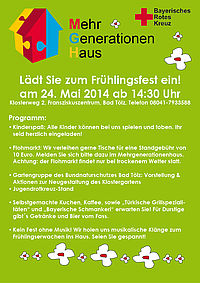 Das BRK-Mehrgenerationenhaus lädt zum Frühlingsfest am 24.05. ab 14:30 Uhr im Klostergarten des Franziskuszentrums in Bad Tölz. Wir freuen uns auf Ihren Besuch!